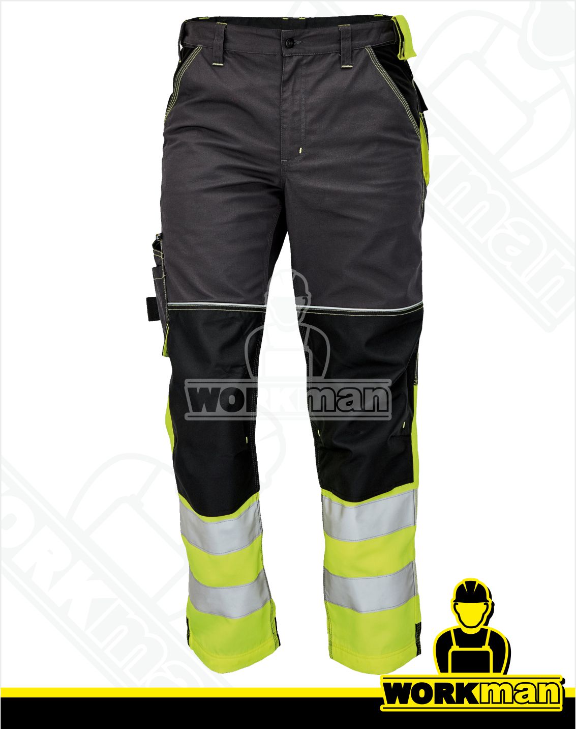 Popis: Pánske pracovné nohavice v kombinácii s hi-vis materiálom v spodnej časti nohavíc a 2 našitými reflexnými pruhmi.