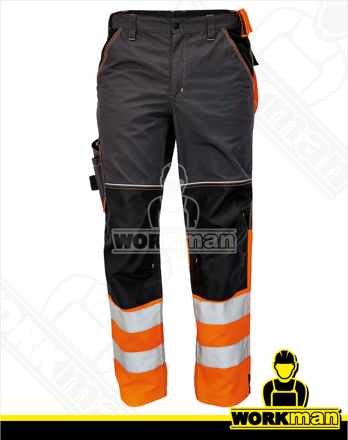 Popis: Pánske pracovné nohavice v kombinácii s hi-vis materiálom v spodnej časti nohavíc a 2 našitými reflexnými pruhmi.