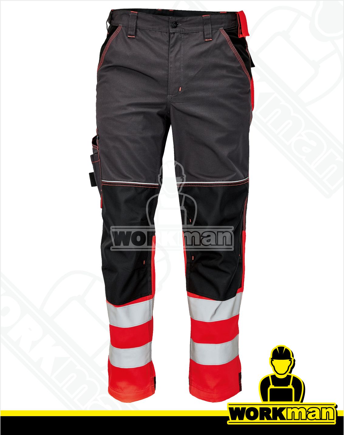 Popis: Pánske pracovné nohavice v kombinácii s hi-vis materiálom v spodnej časti nohavíc a 2 našitými reflexnými pruhmi.