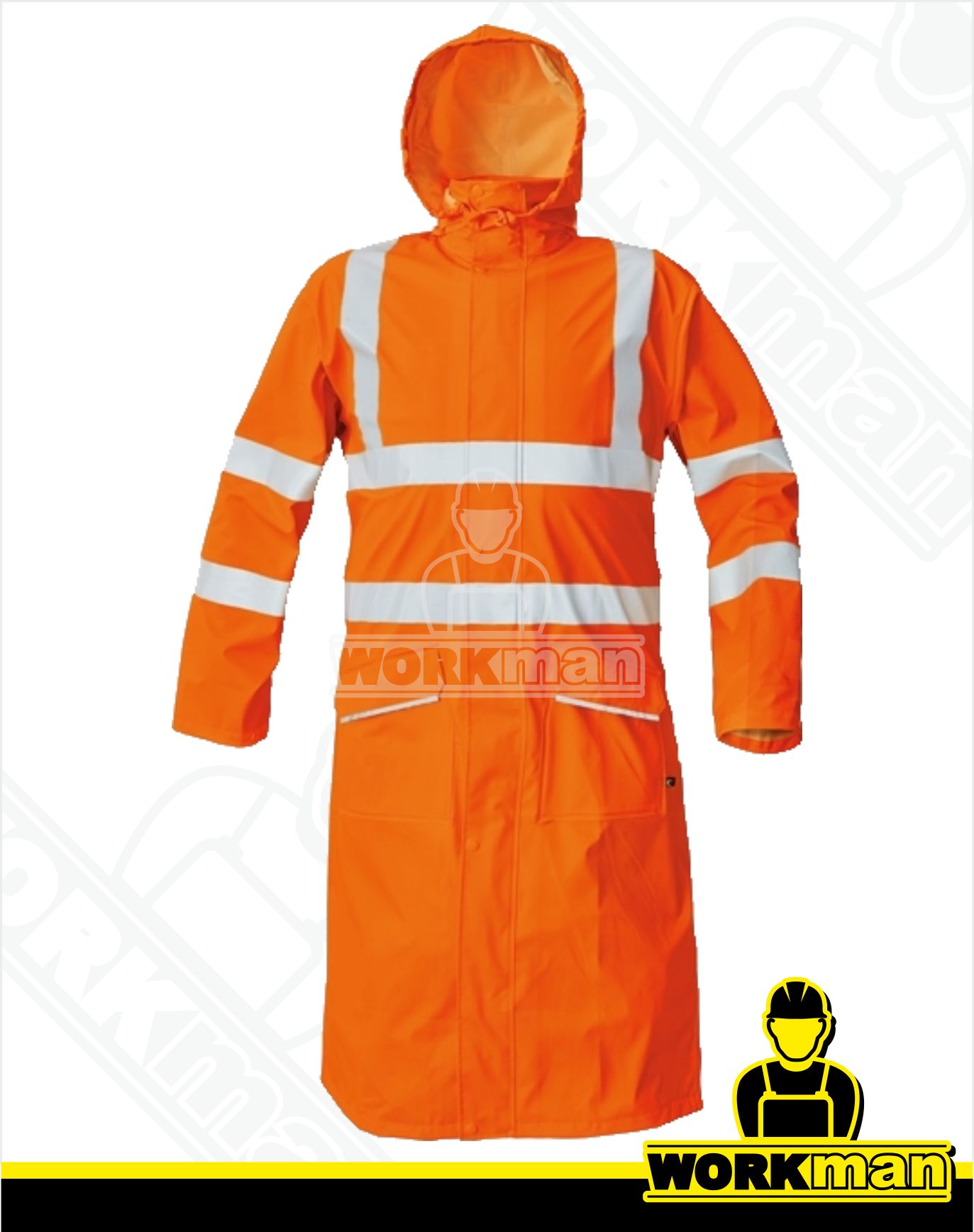 Kompletné špecifikácie Reflexný nepremokavý plášť SIRET HV Červa Popis: Nepremokavý a vetruodolný predĺžený plášť s kapucňou v golieri.  - dĺžka 120 cm - vodný stĺpec 2000 mm - obvod kapucne možno upraviť sťahovaním na šnúrku - dve široké predné vrecká kryté léga proti prieniku vody - spodný lem ruk... celý popis
