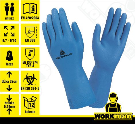 Popis: Latexové rukavice flokované. Dĺžka: 32 cm. Hrúbka: 0,55 mm. Výrobok je v súlade s požiadavkami európskej smernice 89/686, najmä pokiaľ ide o ergonómiu, neškodnosť a pohodlie, a v súlade s normami.