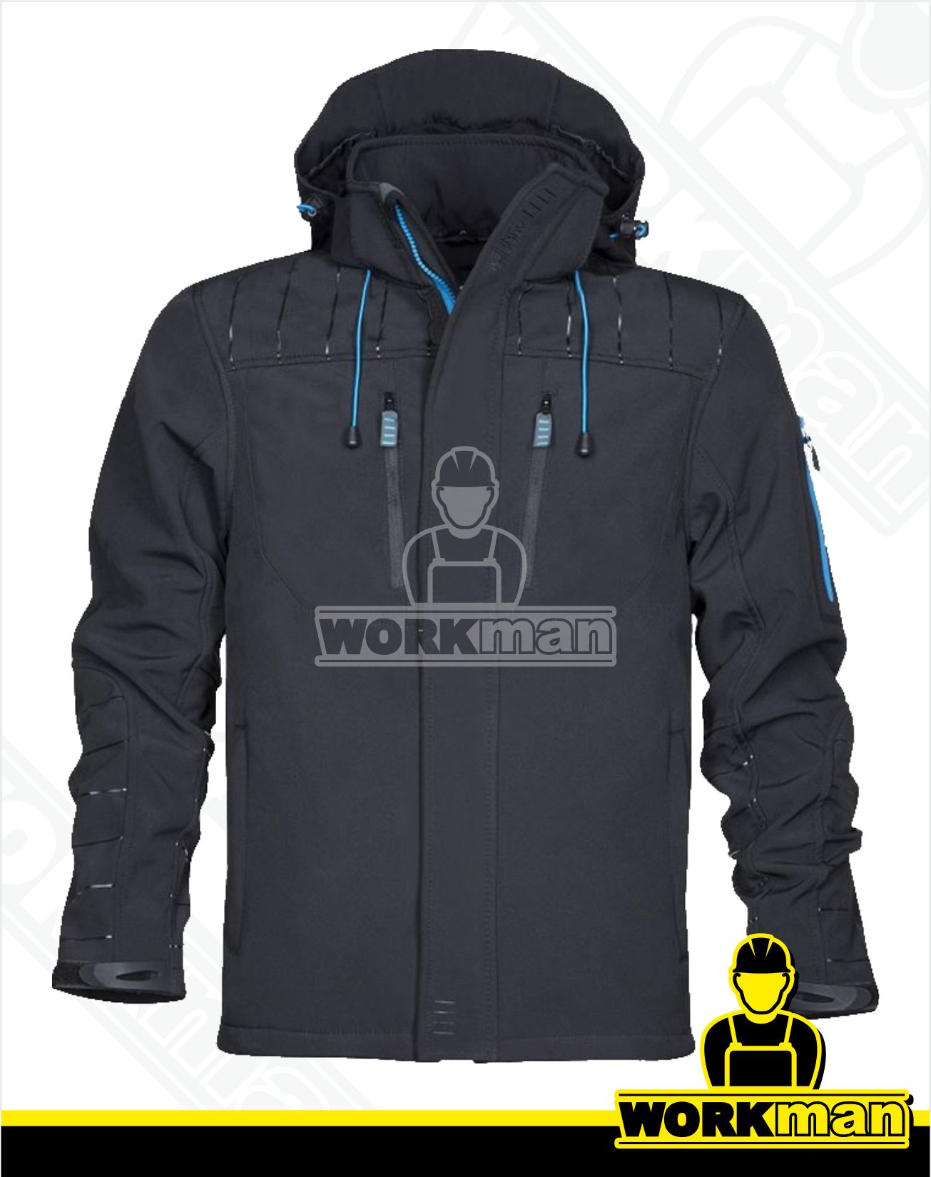 Popis: Luxusná pánska softshellová bunda s dekoratívnou potlačou na sedle a rukávoch. Modré doplnky. Vodoodolnosť 10 000 mm, priedušnosť 800 mm. Odnímateľná kapucňa so sťahovaním pomocou stoperov. Zapínanie na zips krytý légou na suchý zips. 4 vrecká na zips, vrecko na rukáve. Nastaviteľné rukávy pomocou suchých zipsov. Sťahovanie spodného lemu pomocou stoperov.