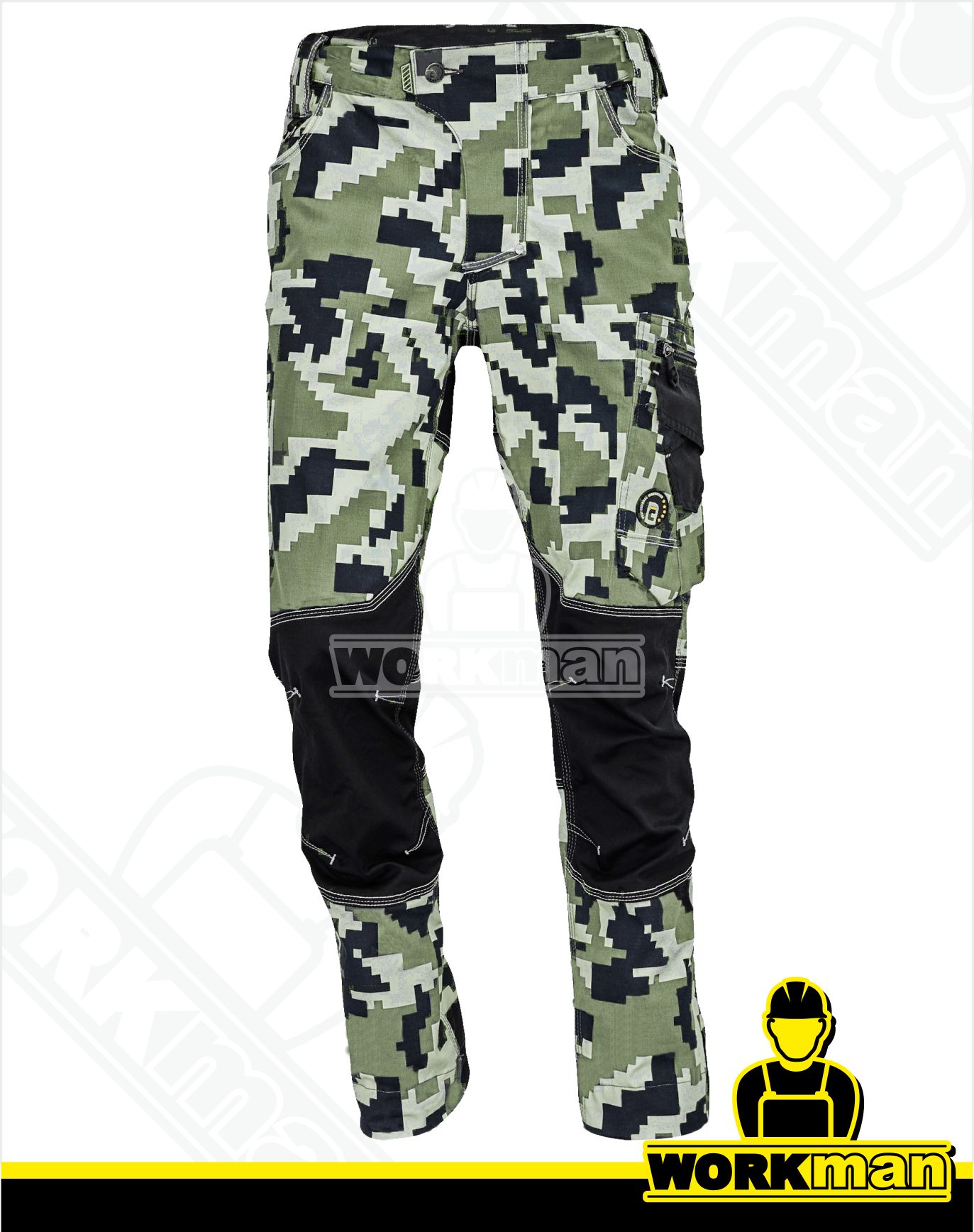 Popis: Pánske pracovné nohavice z elastického materiálu TRIFIBETEX s potlačou camo. 2 predné vrecká s klinom, 2 zadné vrecká so zapínaním na suchý zips a veľké multifunkčné vrecko vľavo.
