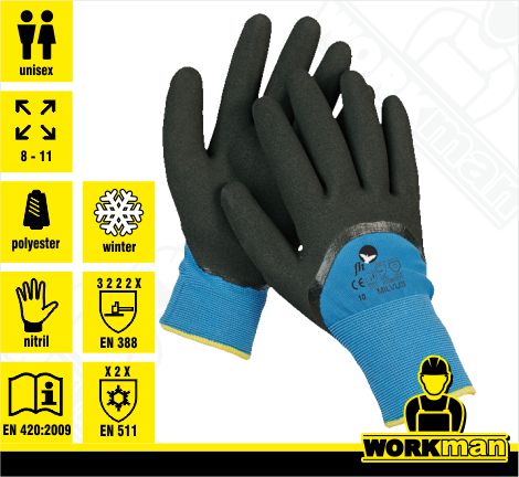 Popis: Zateplené bezšvové rukavice, polyester vonkajšia vrstva, akryl vnútorná vrstva, 2x máčané v čiernom nitrile s finálnou pieskovou úpravou.
