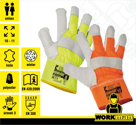 Popis: Zateplené rukavice z jednofarebnej jemnej lícovej hovädziny v dlani a polyesterového úpletu v reflexnej farbe na chrbte a manžete. Stupeň ochrany proti prerezaniu 3.
