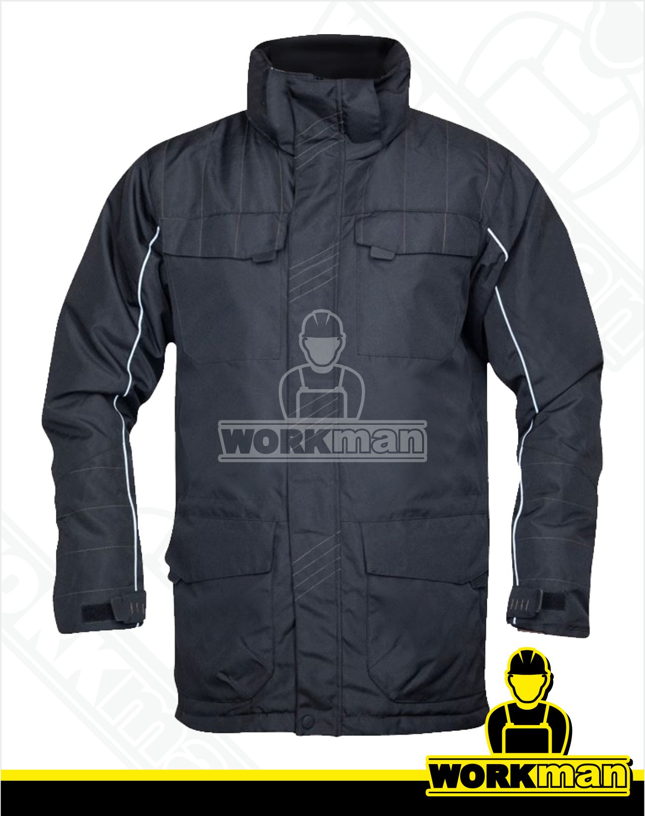Popis: Pracovná zimná bunda s odnímateľnou kapucňou. Pevný a odolný materiál. Vodoodolný materiál 100 % polyester 450D x 450D, PU záter. Zateplenie 100 % polyester, 100 g/m². Taffetová nedrhnúca podšívka. Spodné a horné vrecká s pätkami na suchý zips. Hlavné zapínanie na zips krytý légou na suchý zips a patentky. Nastaviteľná šírka rukávov na suchý zips. Pružný úplet na vnútornej strane goliera.Vnútorné vrecká na zips. Sťahovanie v páse a spodného lemu pomocou stoperov na vnútornej strane.