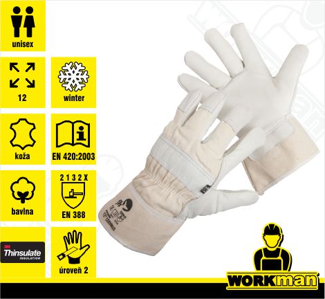 Popis: Komfortné kombinované zimné rukavice z hovädzej lícovky a bavlneného plátna, zateplené materiálom Thinsulate 40 g. Stupeň ochrany proti prerezaniu 1.