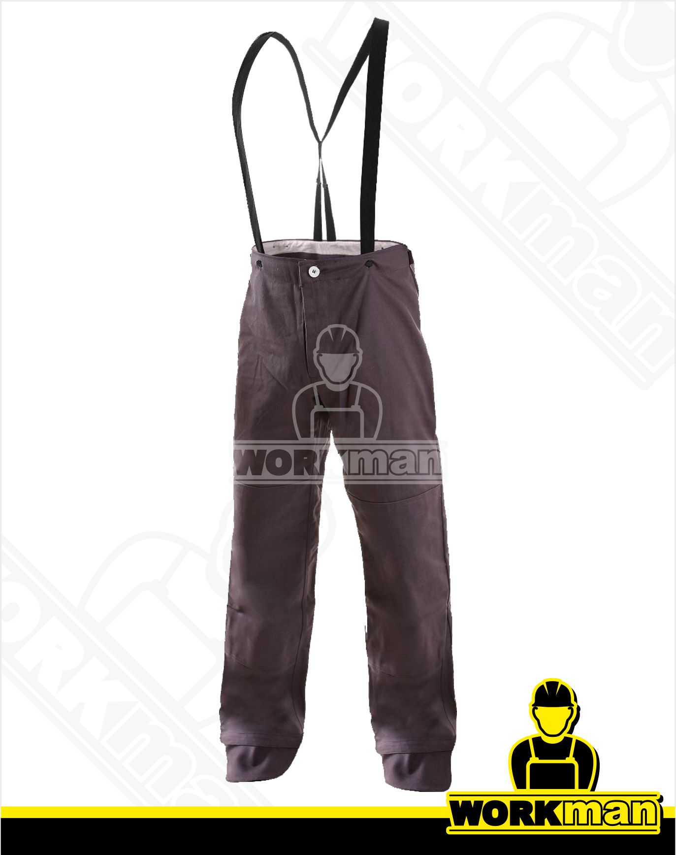 Popis: Pánske nohavice pre zváračov, zdvojené kolená, voľný pas so zapínaním na gombíky, traky, kryty cez obuv. Keper s nehorľavou úpravou PROBAN 100% bavlna, nehorľavé nite