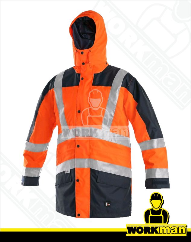 Popis: Výstražná bunda s vysokou viditeľnosťou, s odnímateľnou vnútornou bundou, 5 v 1, odolná proti vode a vetru, kapouce v golieri, 3M reflexné pruhy, vnútorné vrecko na mobil, lepené švy.