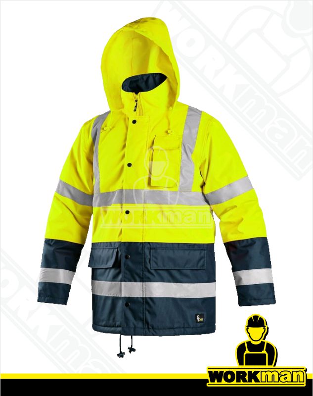 Popis: Výstražná bunda s vysokou viditelnosťou. Zateplená, odolná proti vode a vetru.
