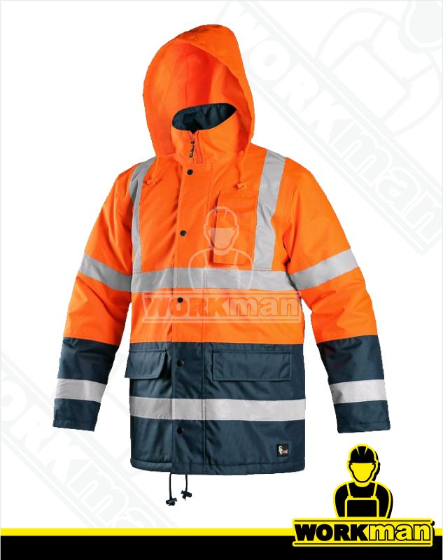 Popis: Výstražná bunda s vysokou viditelnosťou. Zateplená, odolná proti vode a vetru.